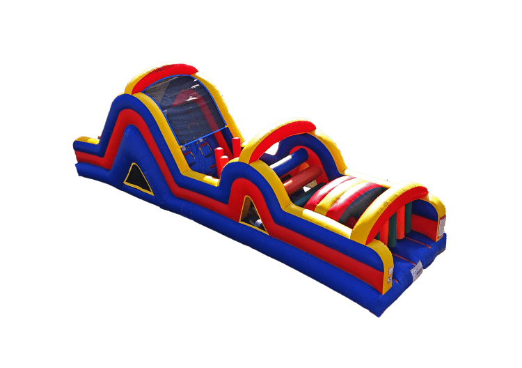 Participants race through a series of obstacles ; pushing through pop-ups, squeezing through openings, and navigating their way to the end as quickly as possible. The compact 39’ design makes it perfect for backyards while still delivering a full obstacle course experience.
