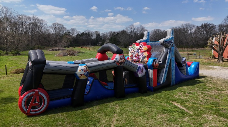 Turn 'em Loose! Inflatables brings the action with our 50FT Avengers Obstacle Course (Wet or Dry) ; one of the biggest and most exciting units we offer! Perfect for birthday parties, school events, and backyard celebrations, this massive inflatable features bold Avengers graphics and vibrant colors that instantly grab attention and become the centerpiece of any party.